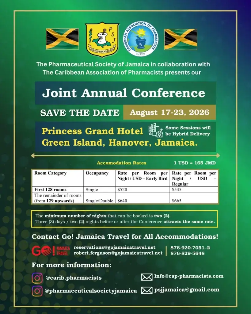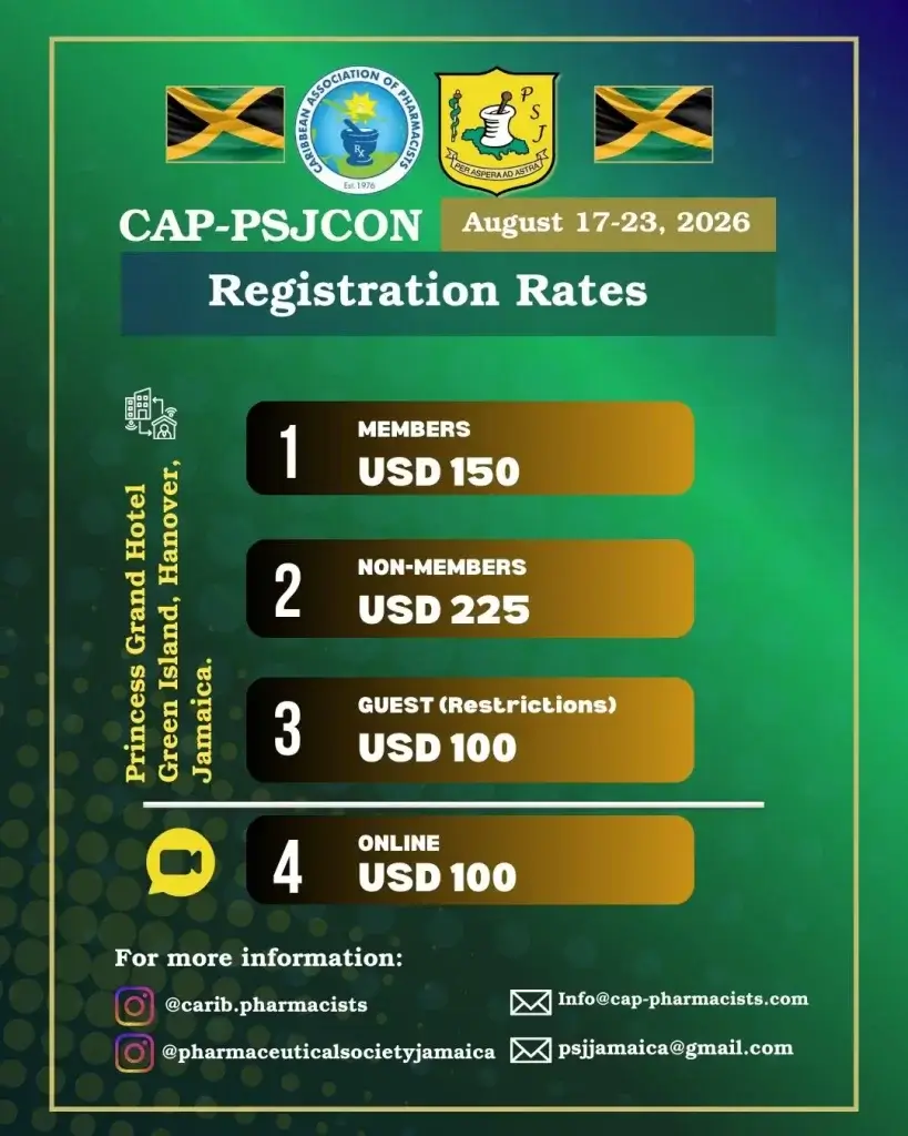 « All Events CAP & Pharmaceutical Society of Jamaica Joint Annual Conference 2026 August 17 - August 23 « Spring Meeting 2026 Pay Registration OnlineShare Add to calendar Google Calendar iCalendar Outlook 365 Outlook Live Details Start: August 17 End: August 23